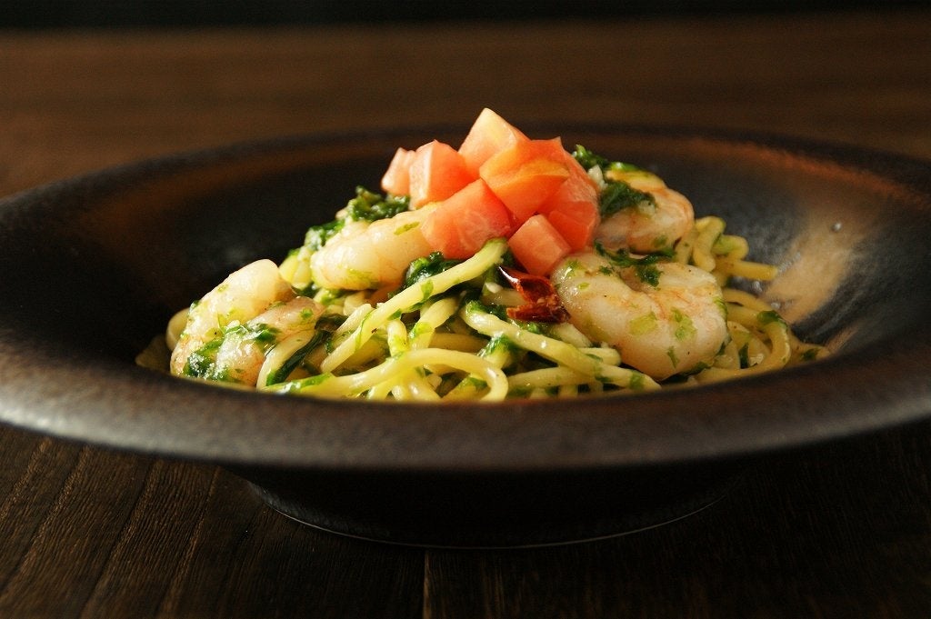 プリプリの海老と海の旨み青海苔が味の深い味わいのペペロンチーノに仕上げます。