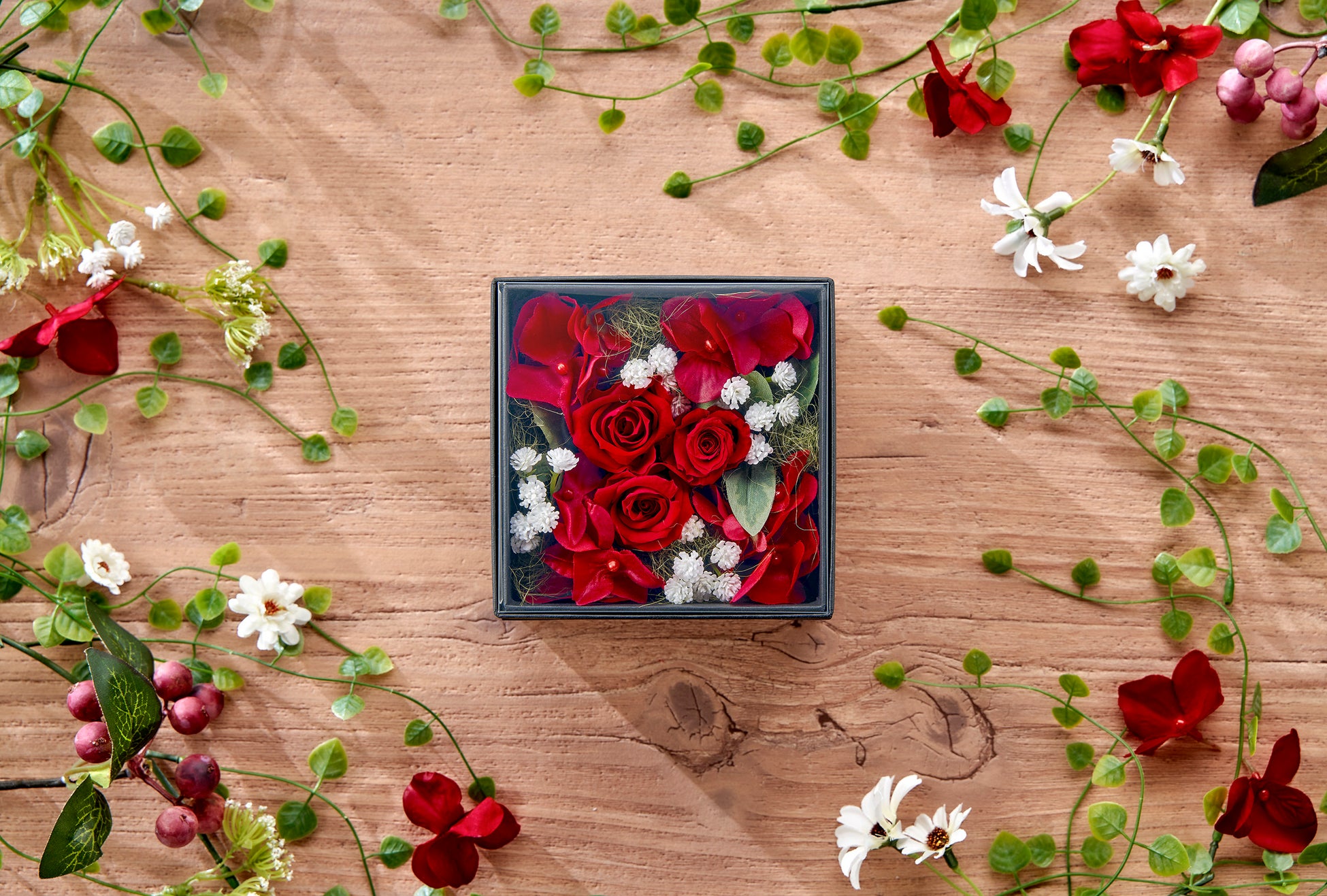 「ルベル」は、冬の贈り物に人気のカラーリング、レッド・ホワイト・グリーンを基調とした、プリザーブドフラワーのローズをメインに、アーティフィシャルフラワーのアジサイ・カスミソウをあしらった、エレガントで贅沢なボックスアレンジメントです。大切な方々と心温まる華やかな時間を過ごしていただきたいというメッセージを込めました。