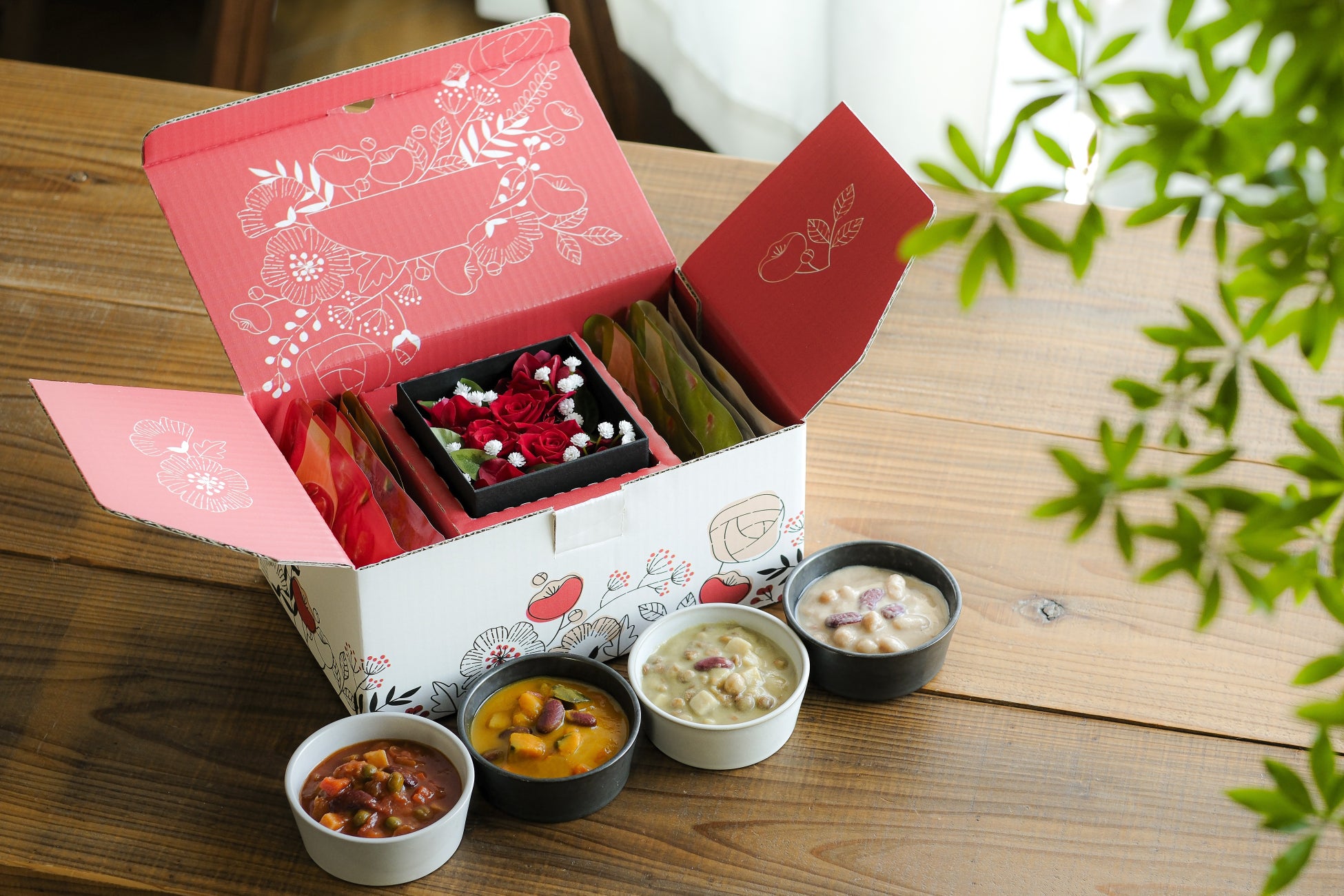 『食卓彩る花とポタージュギフトセット』は、色鮮やかな美しさとソフトな風合いを長期間にわたって保ち続けるプリザーブドフラワーを用いた、日比谷花壇オリジナルデザインのフラワーボックス「ルベル」1箱と、カゴメの「野菜と豆の具だくさんポタージュ」4種×2袋がセットになった、ここでしか手に入らない数量限定の特別品です。