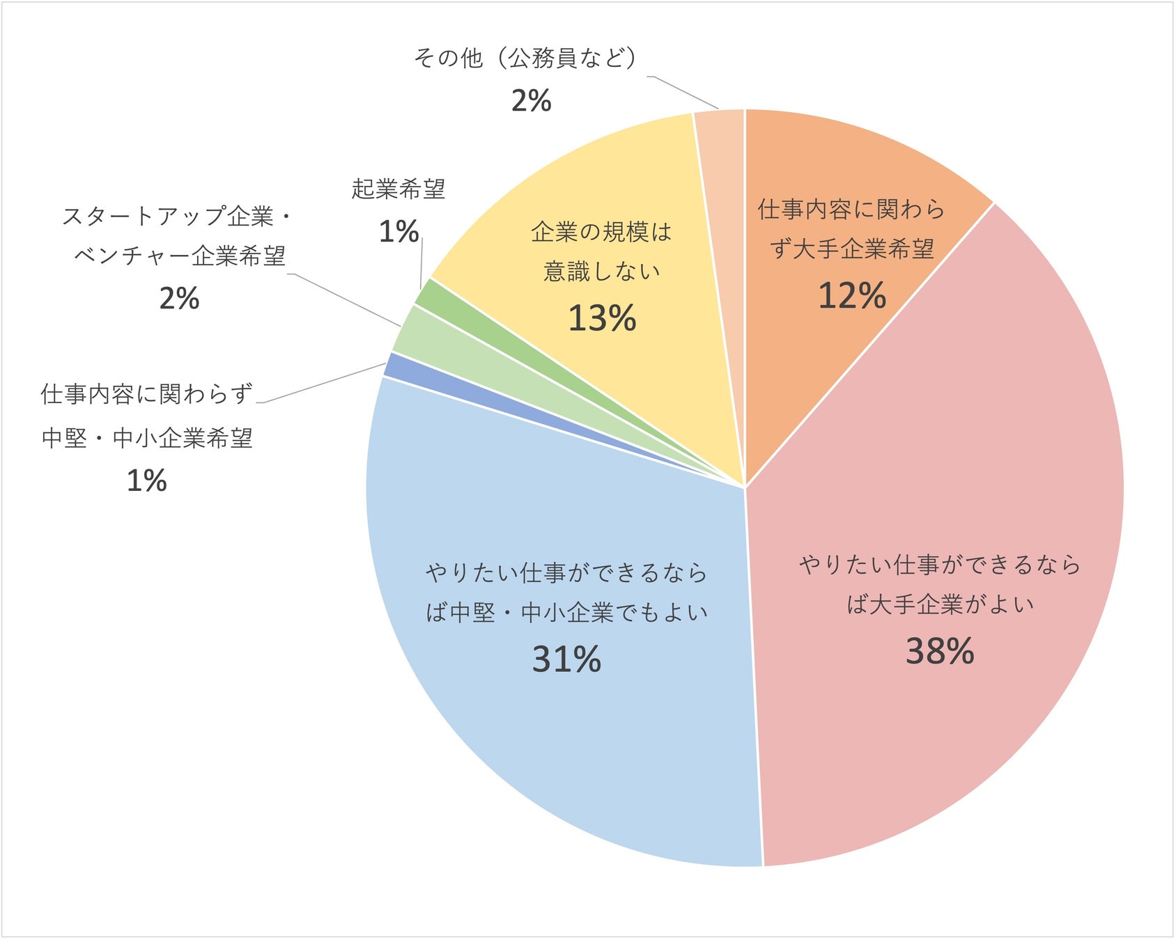 その中でも、「やりたい仕事ができるなら大企業がよい」が38%、「やりたい仕事ができるなら中堅・中小企業でもよい」が31%となった。