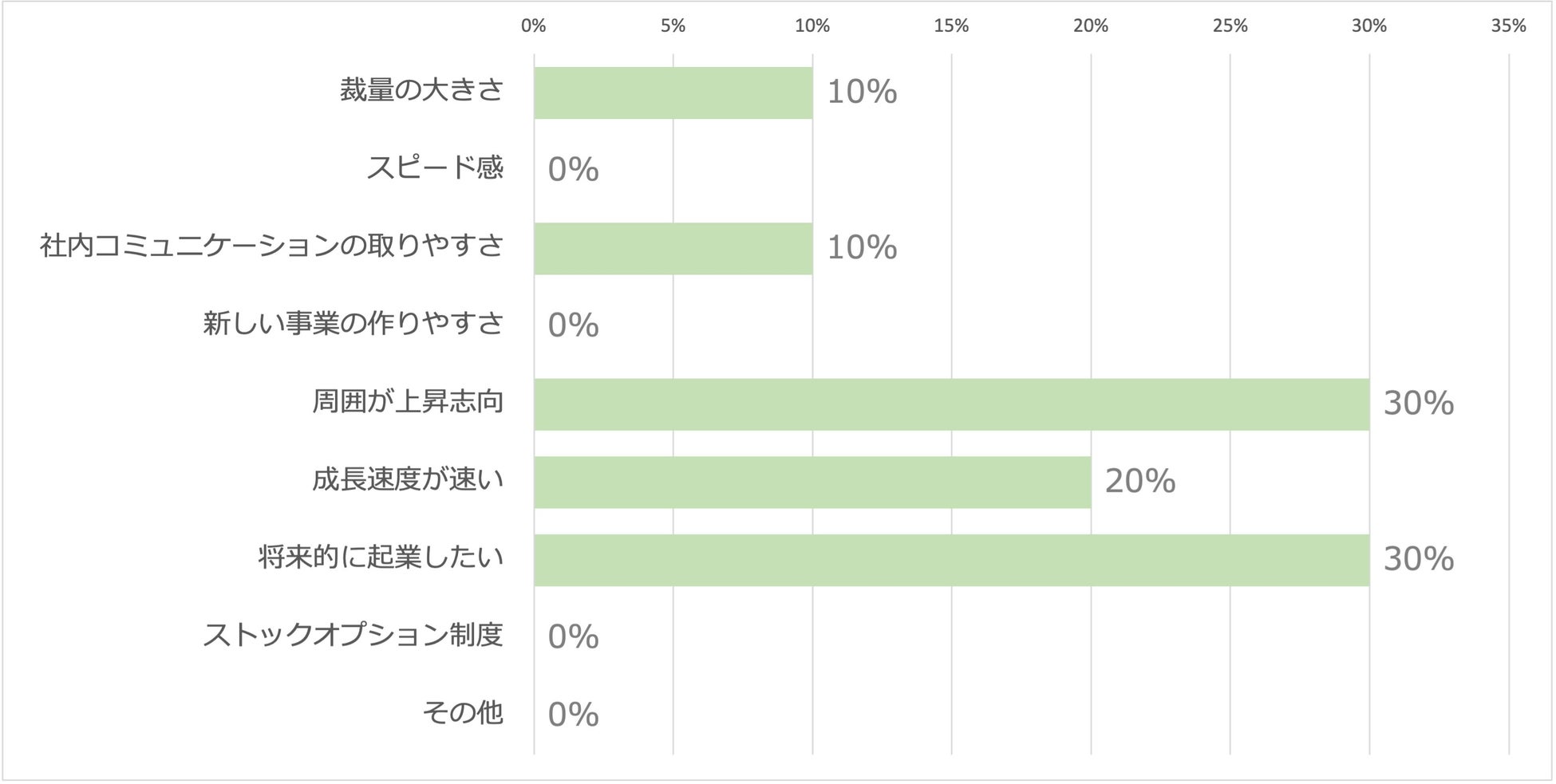 母数は少ないですが、Q3でスタートアップ企業・ベンチャー企業を選択した方に(「Q6.スタートアップ企業・ベンチャー企業希望の魅力と感じているところは?」(n=10)と質問したところ、「上昇志向が高い空間で働けること」や「将来的に起業を考えており、ノウハウを学びたい」といった回答が多く集まった。