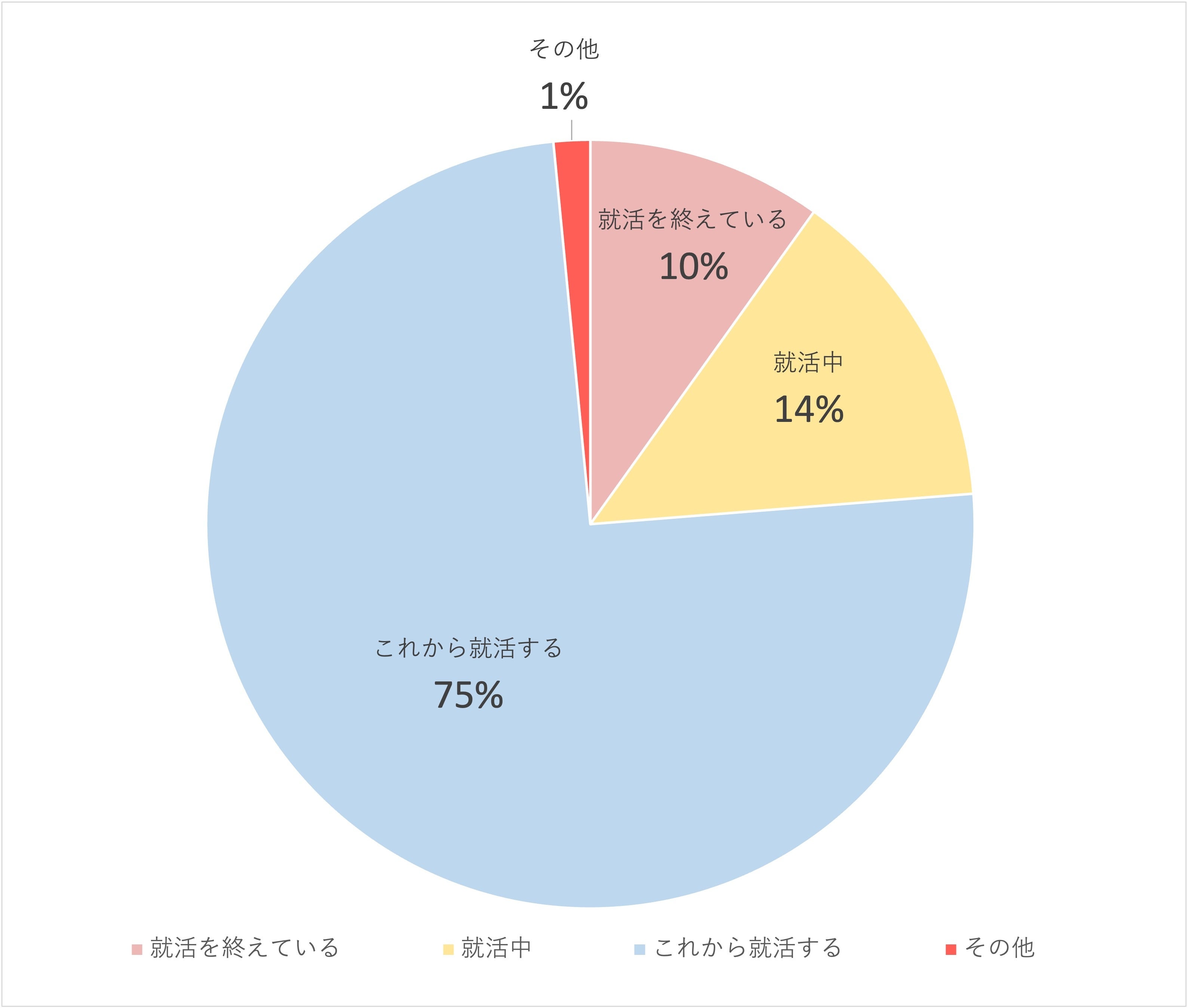 大学生455名を対象に、「Q1.現在の就職活動状況を教えてください。」と質問したところ「就活を終えている」が10%、「就活中」が14%、「これから就活する」が75%となった。そのほか、「大学院に進む」や「自身で起業する」、「まだ進路がわからない」といった回答も集まった。