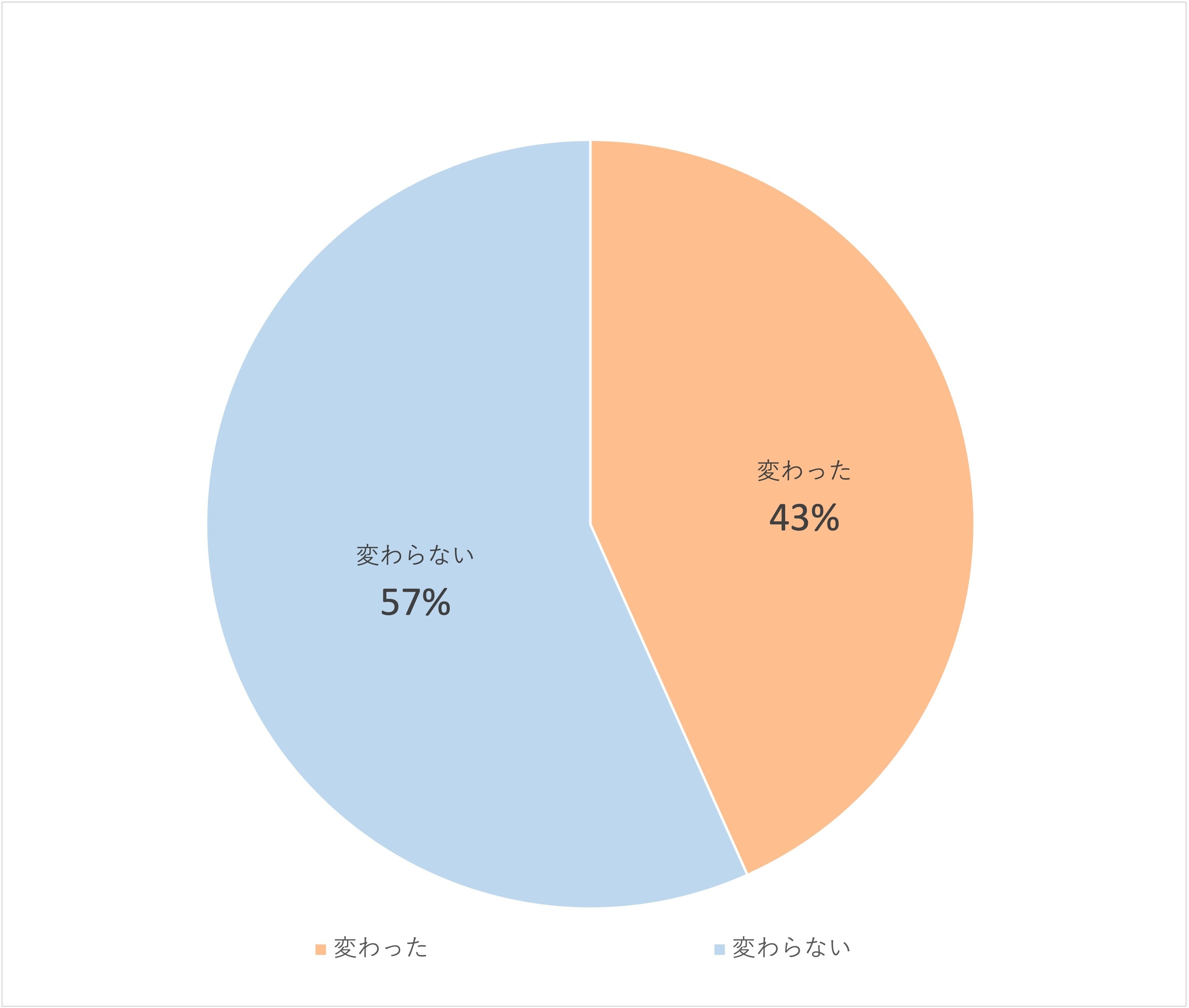 「Q10.新型コロナの流行以降、就職活動の企業選びや働くことに対する考え方は変わりましたか?」(n=455)と質問したところ「変わった」が43%、「変わらない」が57%となった。
