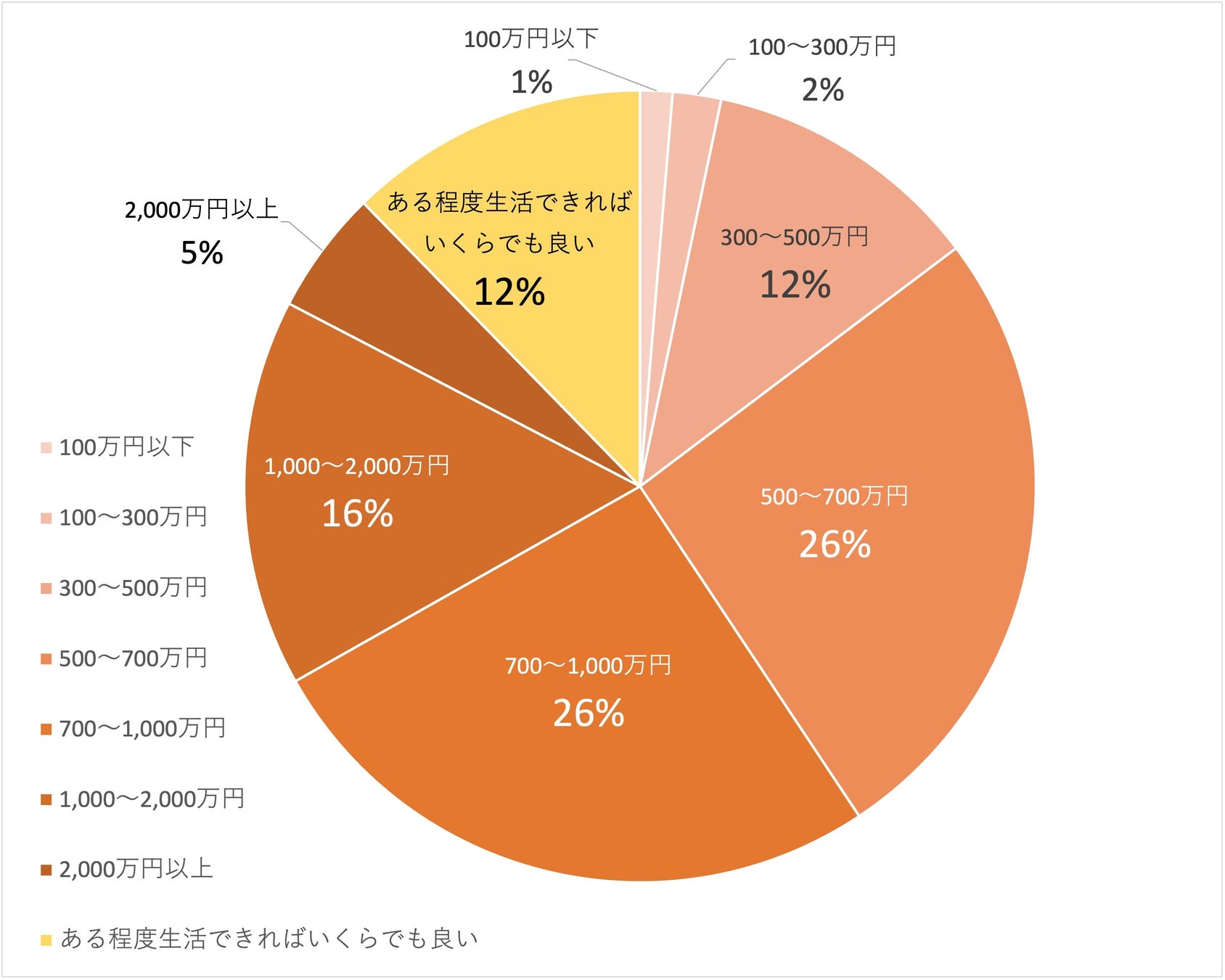 「Q9.35歳くらいになったとき、いくら稼いでいれば良いと考えますか?」(n=455)と質問したところ、「500〜700万円」と「700〜1,000万円」という意見が同率で最多となった。
