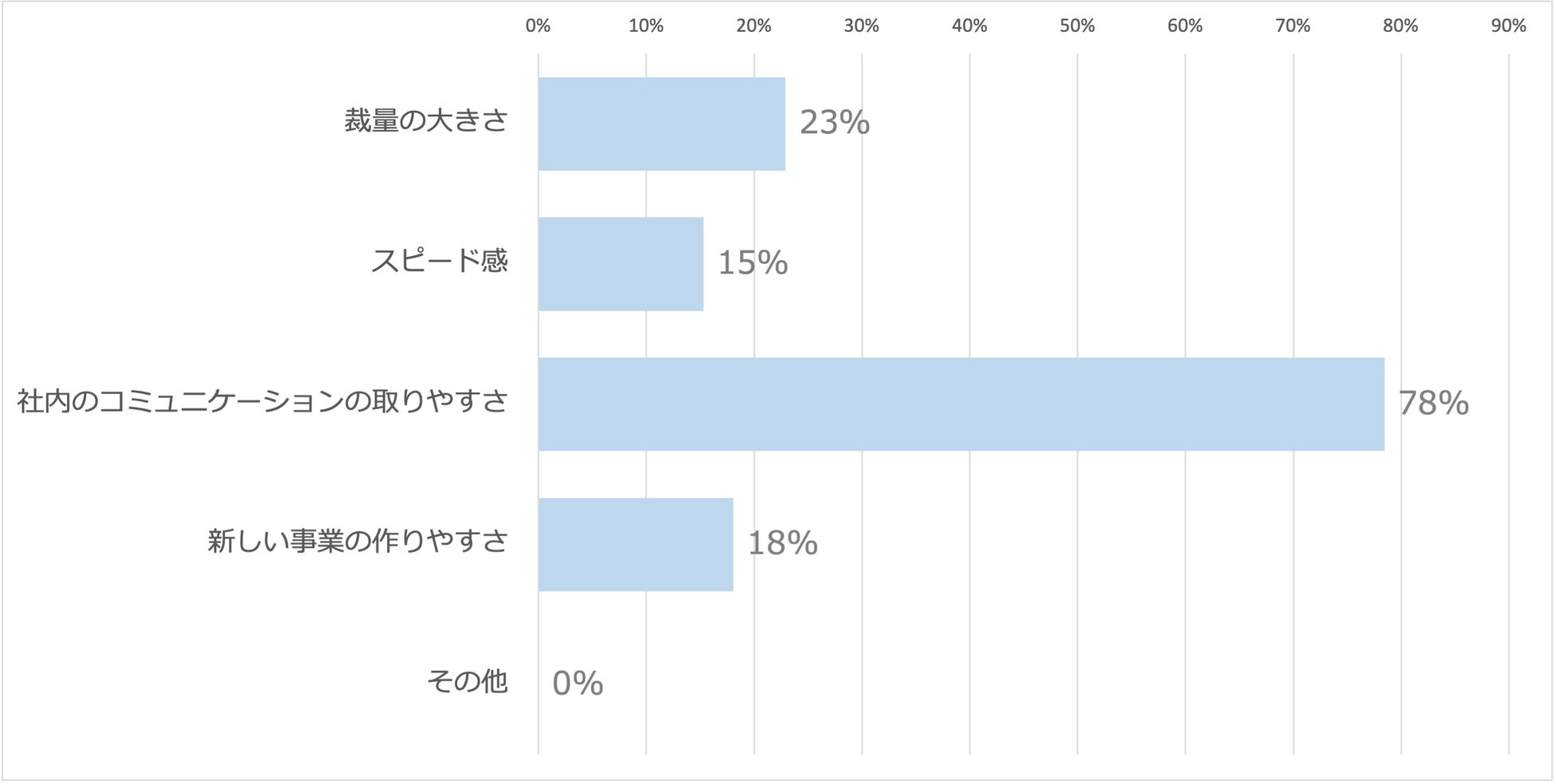 Q3で中小企業を選択した方に、「Q5.中堅・中小企業の魅力だと感じているところは?」(n=144)と質問したところ、「社内のコミュニケーションの取りやすさ」に魅力を感じているという意見が多かった。