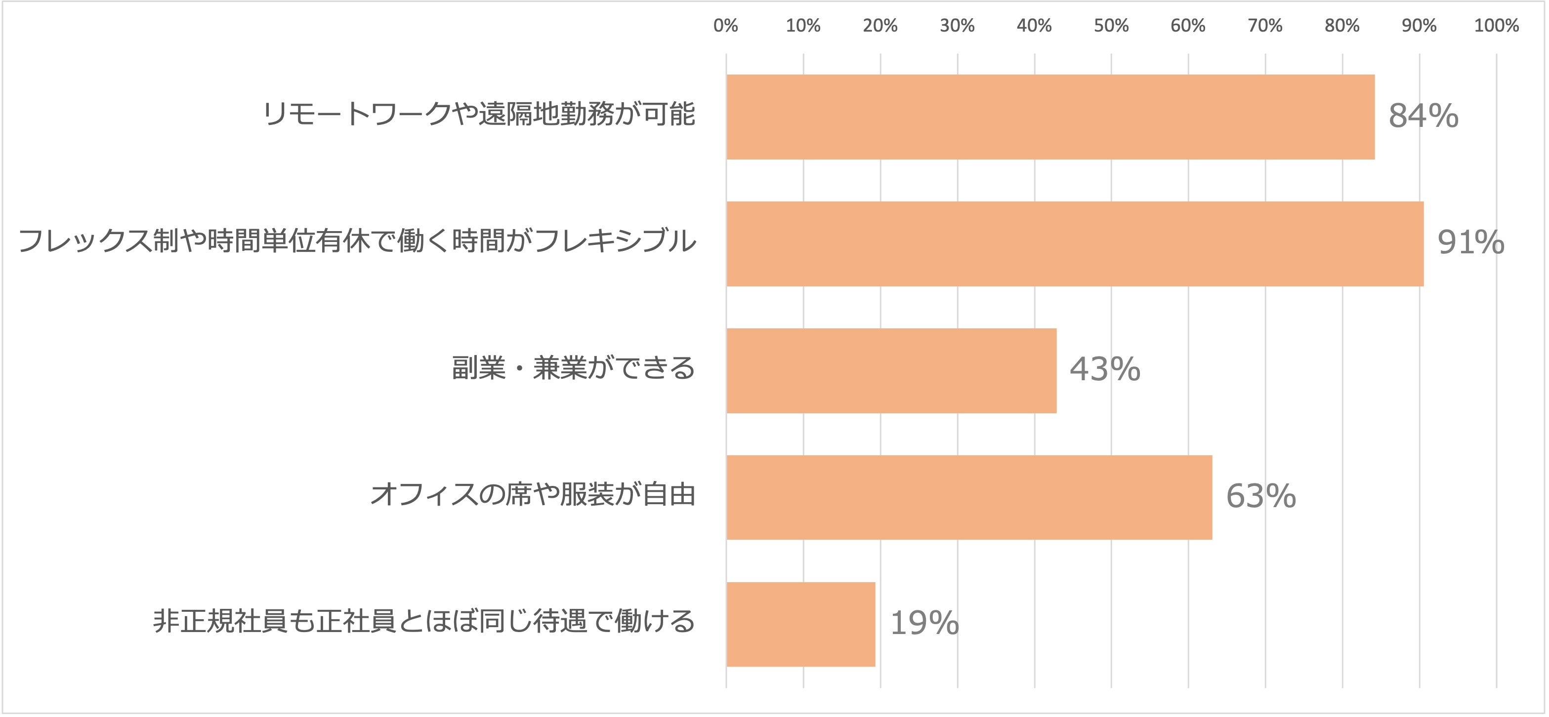 次に、大学生455人を対象に「Q7.どのような働き方ができる会社に魅力を感じますか?」(n=455)と質問した。その結果、「フレックス制や時間有給で働くことができる」や「リモートワーク・遠隔地勤務が可能であること」が理想の条件であると回答する方が、多く見受けられた。