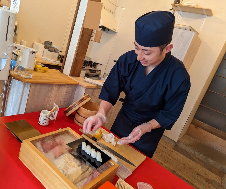 ケータリングでお寿司をいただける特別感を、弊社のサテライトオフィスのご近所さんで、いつもお世話になっている方にも日頃の感謝の気持ちを込め一緒に味わっていただきたく、ぜひその方にもお寿司を召し上がっていただきたいという想いを植松さんご相談したところ、ご快諾くださり、4名分(うち弊社の伊豆半島拠点チームが3名)のケータリングをご用意いただきました。