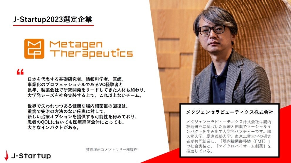 腸内細菌研究に基づいた医療・創薬を推進するメタジェンセラピューティクス株式会社(本社:山形県鶴岡市、代表取締役社長CEO:中原拓)は、経済産業省より、グローバルに活躍するスタートアップを創出する「J-Startup」に選定されました。