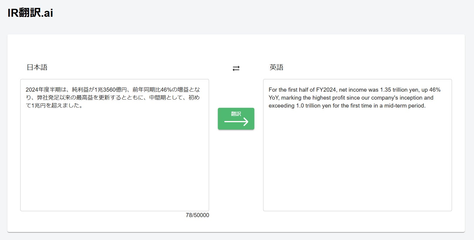 一度に最大5万文字の翻訳が可能(決算説明会:1.5万~2万文字程度)