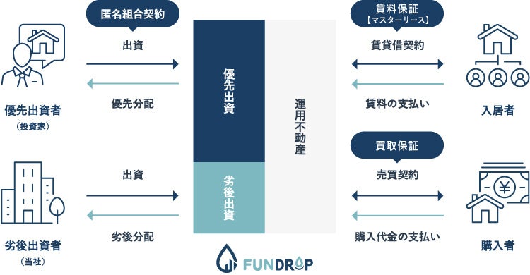 本ファンドは賃料収⼊を配当の原資とする「インカム重視」のファンドです。出資総額の80%を優先出資者である投資家様より募り、劣後出資者である事業者が20%を出資いたしました。万⼀、賃料収⼊が減った場合は、まず投資家様が優先的に分配を受けた後、事業者が劣後して分配を受け取る「優先劣後構造」を採⽤しております。