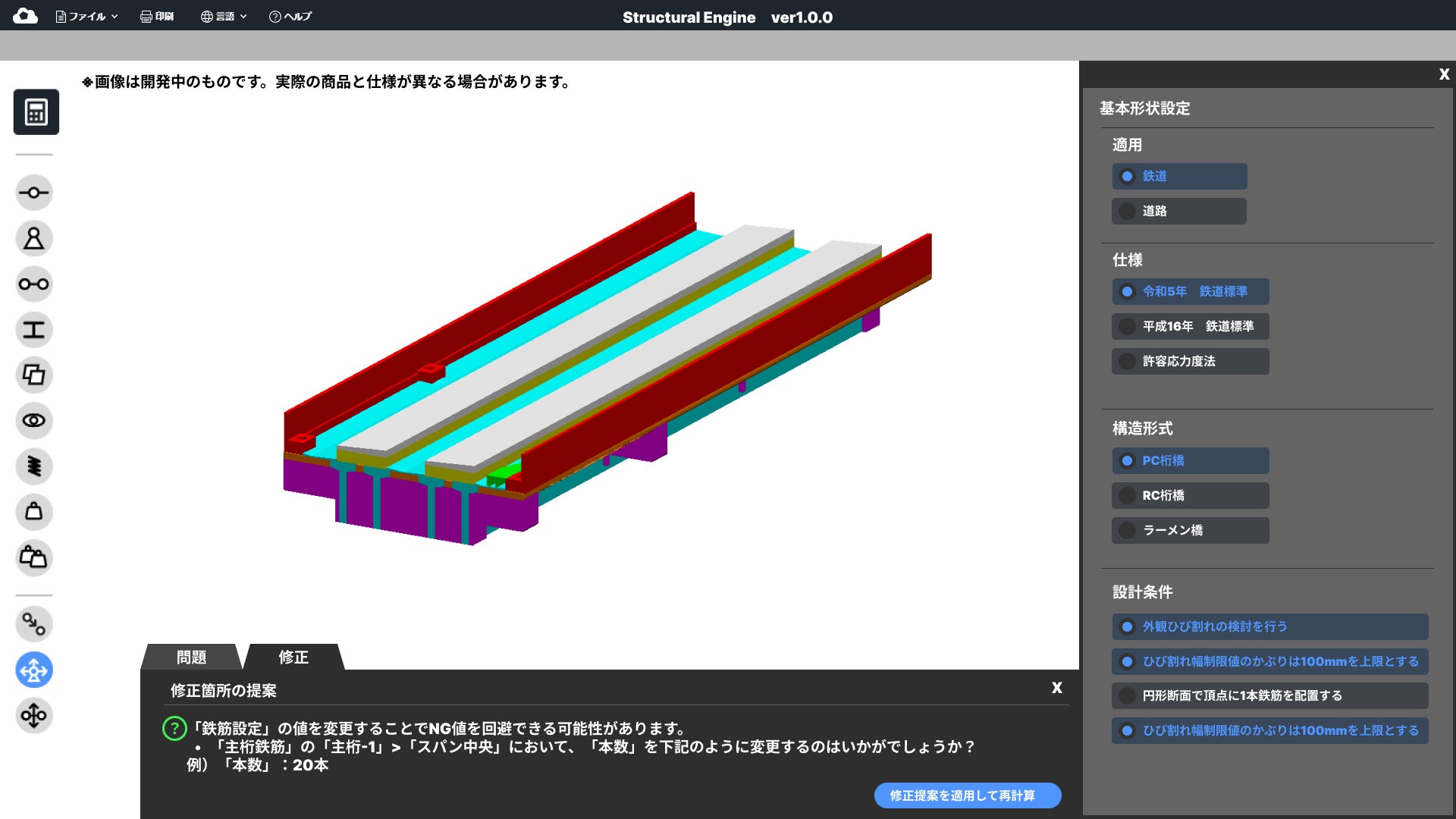 一般図と呼ばれる計画内容を全般的に示した図面から、該当する数値や設計条件を「Structural Engine」に入力すると、BIM/CIMモデルの自動作成や構造設計計算書が出力される画期的なツールです。これまで、概略図面から構造解析・性能照査・BIM/CIMモデル作成・資料作成を複数の専門技術者が行っていましたが、「Structural Engine」が全てを一気通貫で代替することで通常75日かかる作業が3日に短縮し、約300万円のコストダウンができるため圧倒的に生産性が向上します。さらに、設計照査でNGが出た場合、どの部分に問題があったのかを3Dモデルでわかりやすく表示し、NGが出た理由やどのように値を変更したら良いのかという修正方針をレコメンドAIが瞬時に提案することで、誰でも正確な設計を行うことができます。