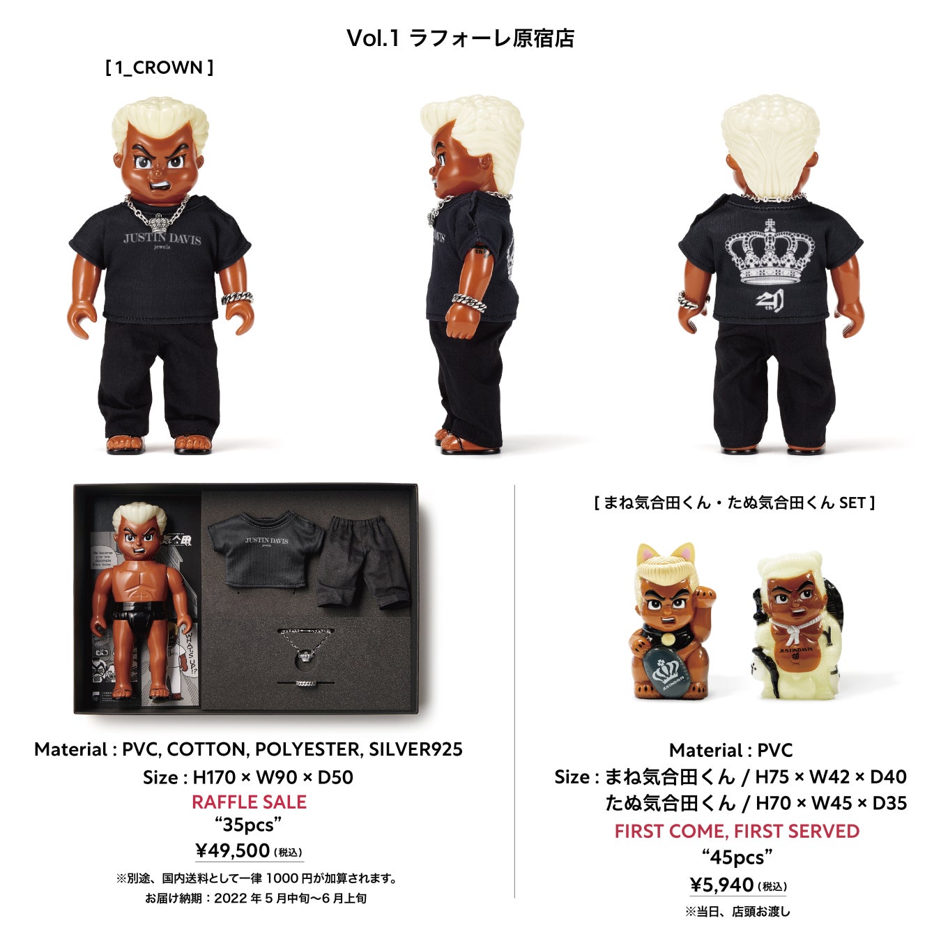 ジャスティン デイビスのアイコンであるクラウンや南京錠、ダイヤモンドを配したラグジュアリーなネックレスやブレスレットを身に付けた限定品に加えラフォーレ原宿店では「まね気合田くん」、「たぬ気合田くん」をセットで先着販売。
