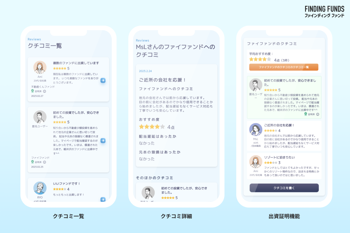 ファンド情報に加え、出資者によるクチコミが投稿されることで、より多くの情報を集約し投資家と事業者にとって価値のあるポータルサイトを目指しています。