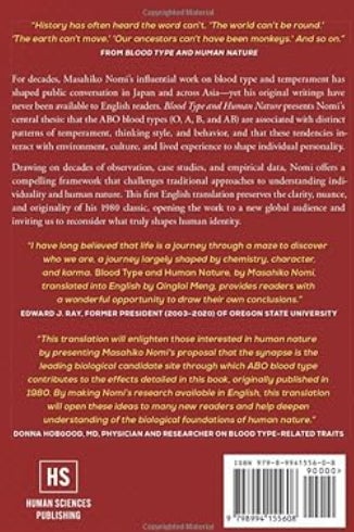 数十年の間、能見正比古による血液型と気質に関する影響力のある著作は、日本とアジア全域の人々との対話を行ってきましたが、彼のオリジナル版は英語圏の読者には利用できませんでした。『Blood Type and Human Nature』は、ABO血液型(O、A、B、AB)が気質、思考スタイル、行動の異なるパターンに関連しており、これらの傾向が環境、文化、生活体験と相互作用して個人の性格を形成するという能見の主要なテーマを提示しています。