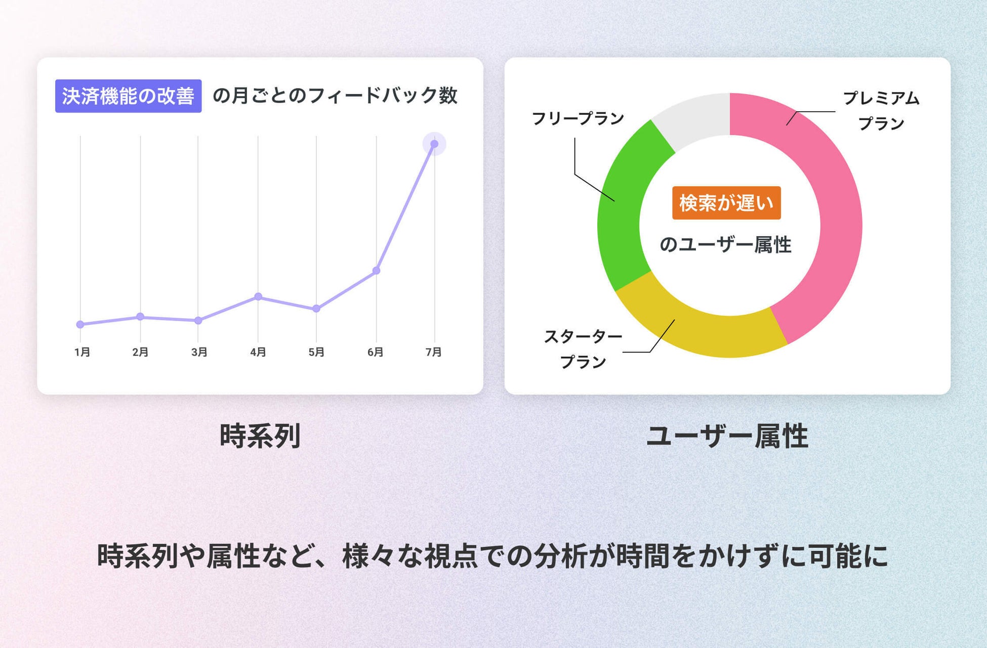 時系列・ユーザー属性など、集められたデータに応じて、自動でレポートを可視化します。月ごとの傾向や、これまでのユーザーフィードバックと異なる傾向のものがあればアラートを飛ばすなど、顧客ニーズの変化を的確につかめる製品開発を目指します。