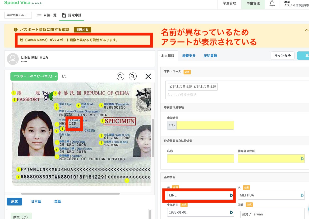 株式会社クスノキ(本社:東京都台東区 代表取締役:浅井拓海)が運営するクラウド留学生在籍管理サービス「SpeedVisa(スピードビザ)」は、在留申請書類の作成時にパスポート画像と申請内容を照合し、不一致を自動で検知する「パスポートチェック」機能を2023年3月8日より提供いたしました。