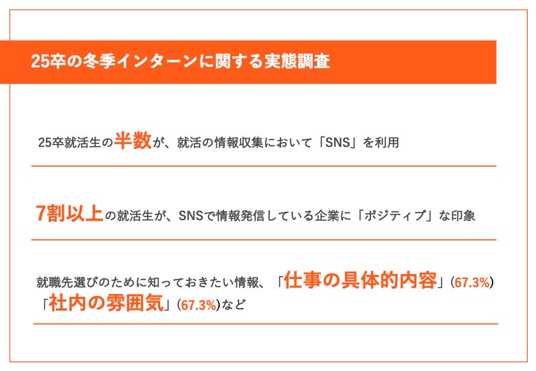 まず、半数の学生が就職活動の情報収集にSNSを活用しており、特に「X(旧Twitter)」を使用している割合が78.8%と多いことが明らかとなりました。また、冬季インターンに期待していることとして、「企業の事業理解」(62.5%)や「適正度合いを確かめること」(52.9%)が挙がりました。さらに、SNSを積極的に情報発信している企業には73.0%の学生がポジティブなイメージを持っていることが明らかとなり、SNSを通じた情報収集や企業理解が、25卒学生にとって重要な役割を果たしていることがわかりました。