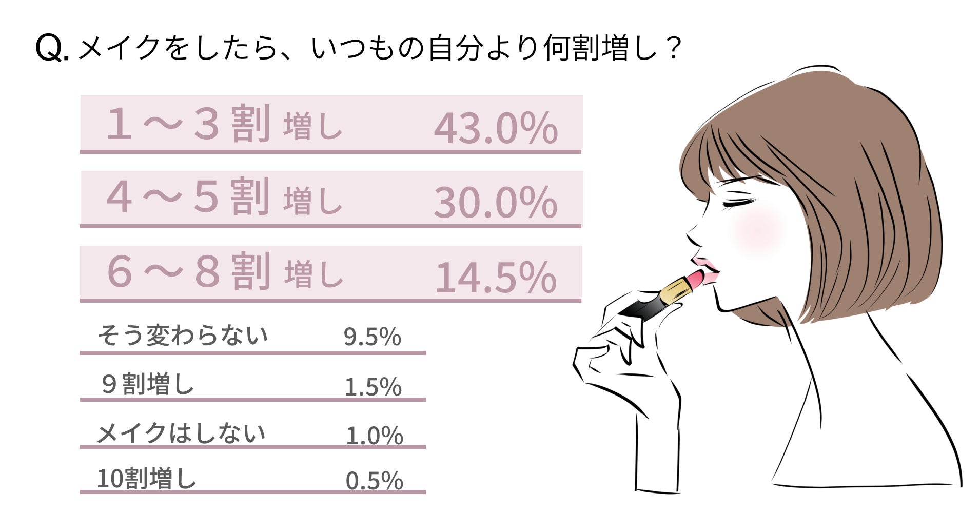「メイクをしたらいつもの自分より何割増ししますか?」というアンケートには「1~3割増し」が43%、「4~5割増し」が30%という結果でした。