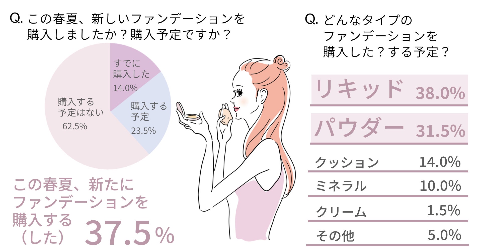 アンケートによると「この春夏に、新しいファンデーションを購入した。あるいは購入予定」という方が37.5%でした。