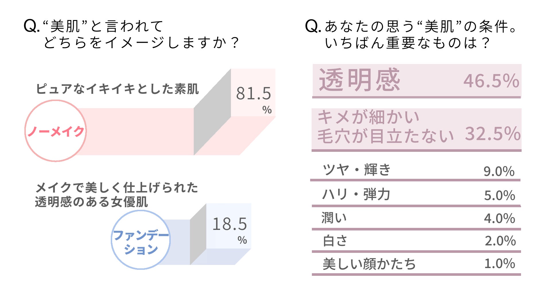 「“美肌”の条件でいちばん重要なものは?」というアンケートに対しては「透明感」が46.5%、「キメが細かい・毛穴が目立たない」が32.5%、「ツヤ・輝き」が9.0%と続きます。
