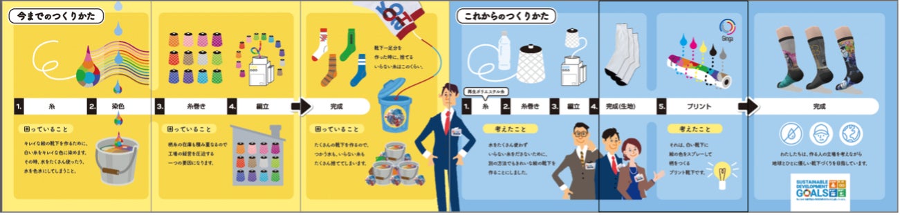 レンフロ・ジャパン株式会社が開発したGINGAは、従来の糸を染めた後編み立て、余分な糸をカットする製法における、染めた糸を洗う工程で河川を汚染すること、カットした糸の廃棄においてCO2を排出することの2点を廃した、環境に優しい靴下専用インクジェットプリント機。GINGAには環境に優しい他、非常に短い納期で極小ロットで生産可能という点でも従来と比較してメリットがあり、今後靴下製造の主流となり得る製法と言われています。