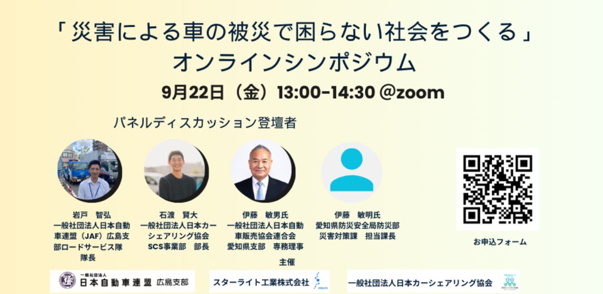 自然災害による車の被災という社会課題に向き合う日本カーシェアリング協会、日本自動車連盟(JAF)、スターライト工業株式会社が共同でオンラインシンポジウムを開催いたします。