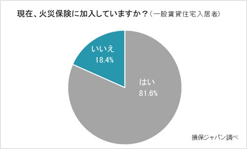 賃貸住宅に入居するにあたっては、万一の火災による大家への賠償責任などを補償する特約を付帯した家財保険の加入が欠かせませんが、損保ジャパンが実施したアンケート結果によると、一般賃貸住宅入居者の18.4%、公営賃貸住宅入居者の48.4%が更新漏れなどによって家財保険に加入していないことがわかりました。※2
