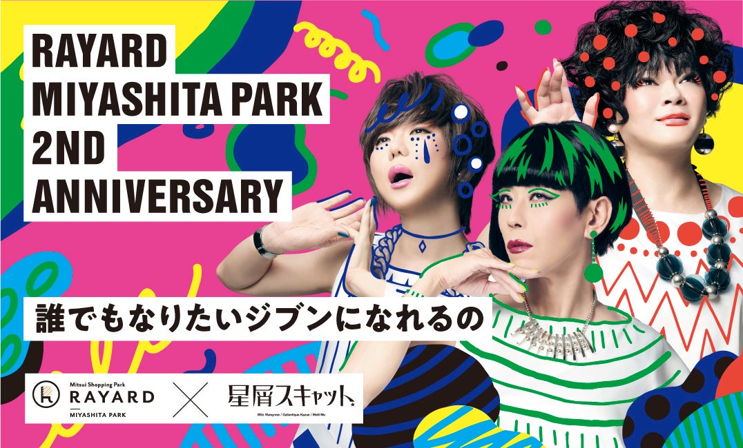 「RAYARD MIYASHITA PARK 2ND ANNIVERSARY」を記念し、音楽ユニット「星屑スキャット」とのコラボが決定!“誰でもなりたいジブンになれる”をテーマとした、3人のカラフルで華やかなビジュアルが館内各所でお楽しみいただけます。さらに、アニバーサリー期間に対象店舗でのお買上げレシート2,500円以上(税込・合算可)提示※で、豪華ギフトカードやショップアイテム、「星屑スキャット」のコラボノベルティグッズ等が当たる抽選会を実施します。