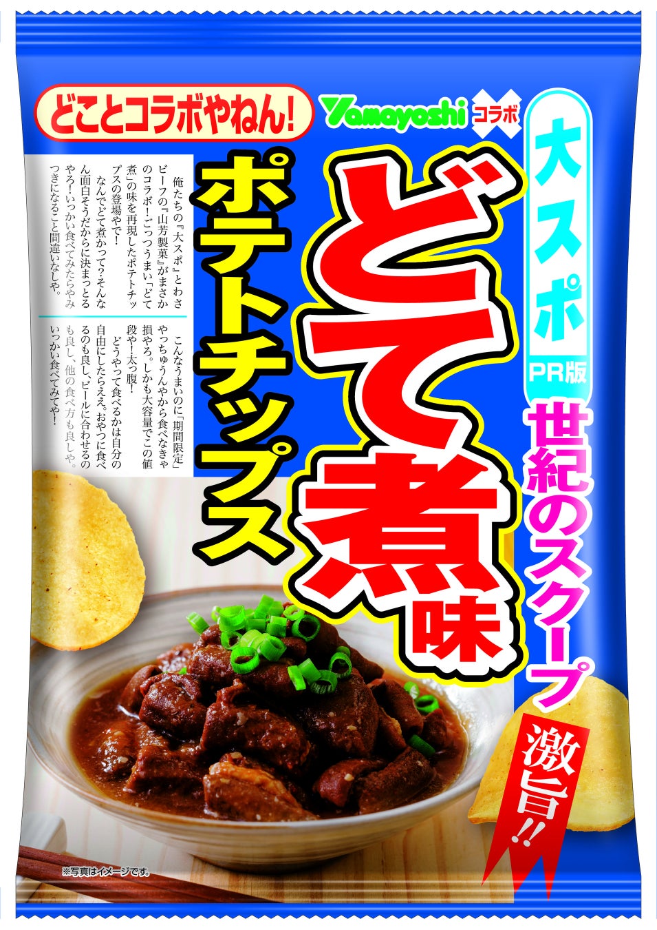 東スポ×山芳製菓のタッグ再び!今度は東スポの西日本版「大阪スポーツ」バージョンで〝ご当地感〟を演出。フレーバーはまさかの「どて煮味」