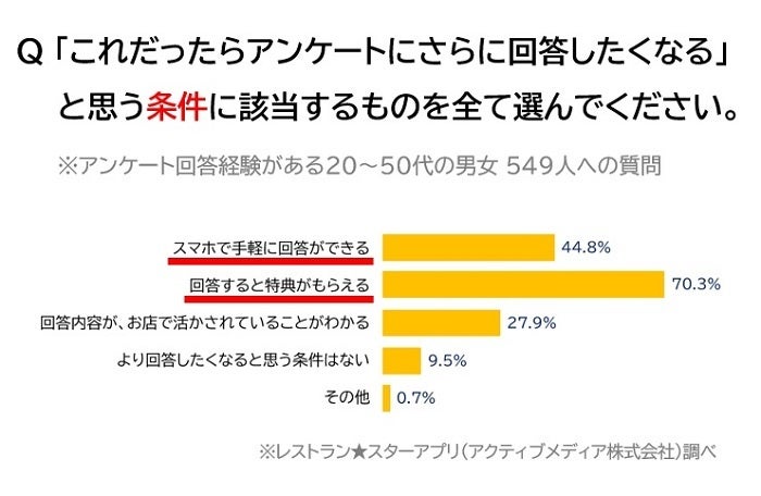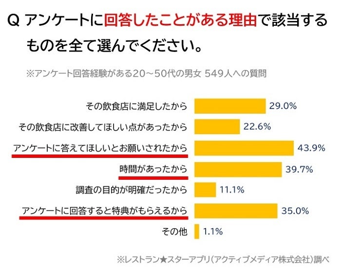 以上の結果から、飲食店は「回答者への特典」をつけて「スマホで手軽に回答ができる」など面倒がないように工夫することで、アンケートに回答した経験のない人にも応えてもらえる可能性が高くなると考えられます。