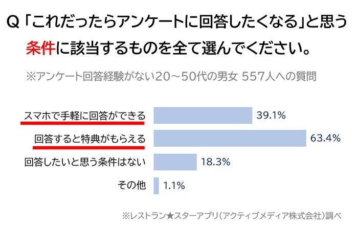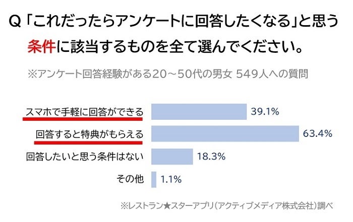 そして、「これだったらアンケートに回答したくなると思う条件は?」という質問にも「回答すると特典がもらえるなら」という答えが63.4%で最多でした。