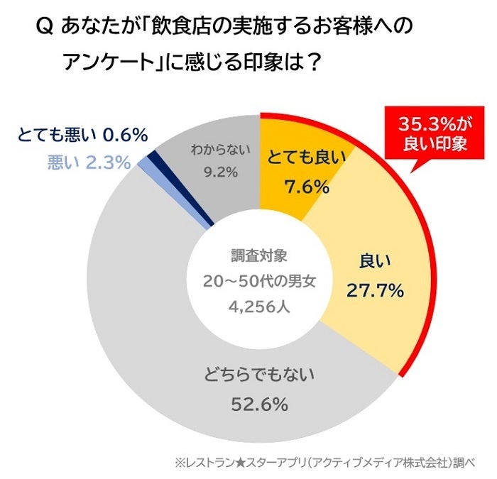 飲食店公式アプリの開発・運用サポートで3,000店以上の実績をもつ「レストラン★スターアプリ」を運営するアクティブ・メディア株式会社(本社:東京都千代田区 代表:磯島順一郎)は「飲食店を利用する20~50代の男女(4,256人)」を対象に『飲食店がお客様に実施するアンケート調査に関する消費者の意識調査』を2022年10月6日~10月12日に実施しました。