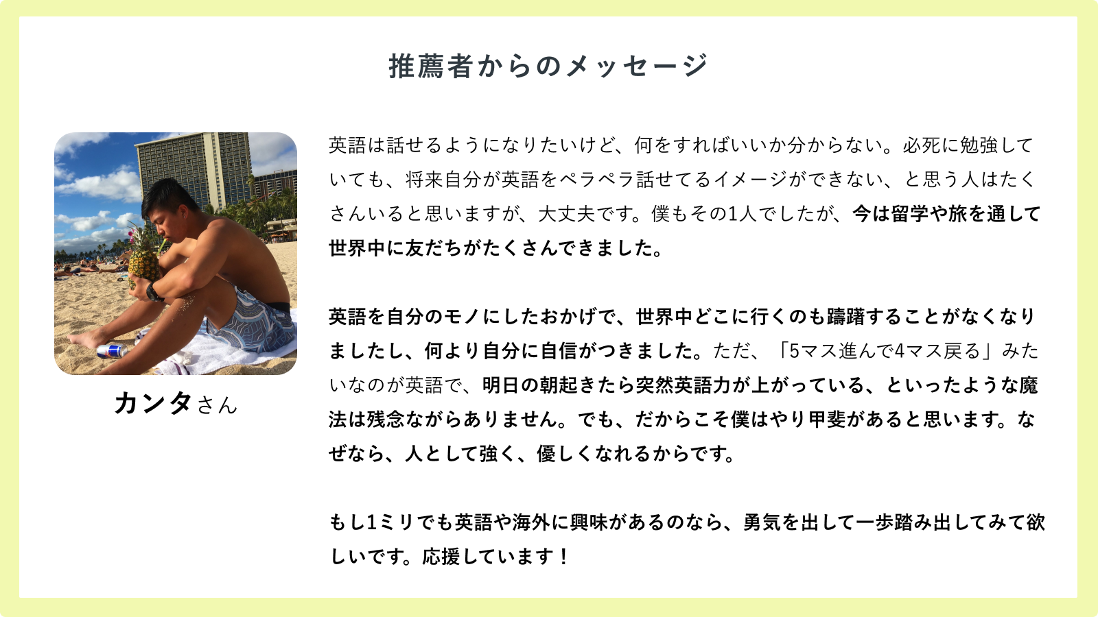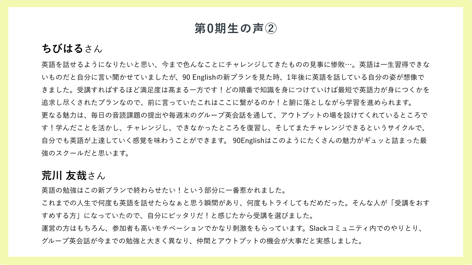 英語を話せるようになりたいと思い、今まで色んなことにチャレンジしてきたものの見事に惨敗…。英語は一生習得できないものだと自分に言い聞かせていましたが、90 Englishの新プランを見た時、1年後に英語を話している自分の姿が想像できました。