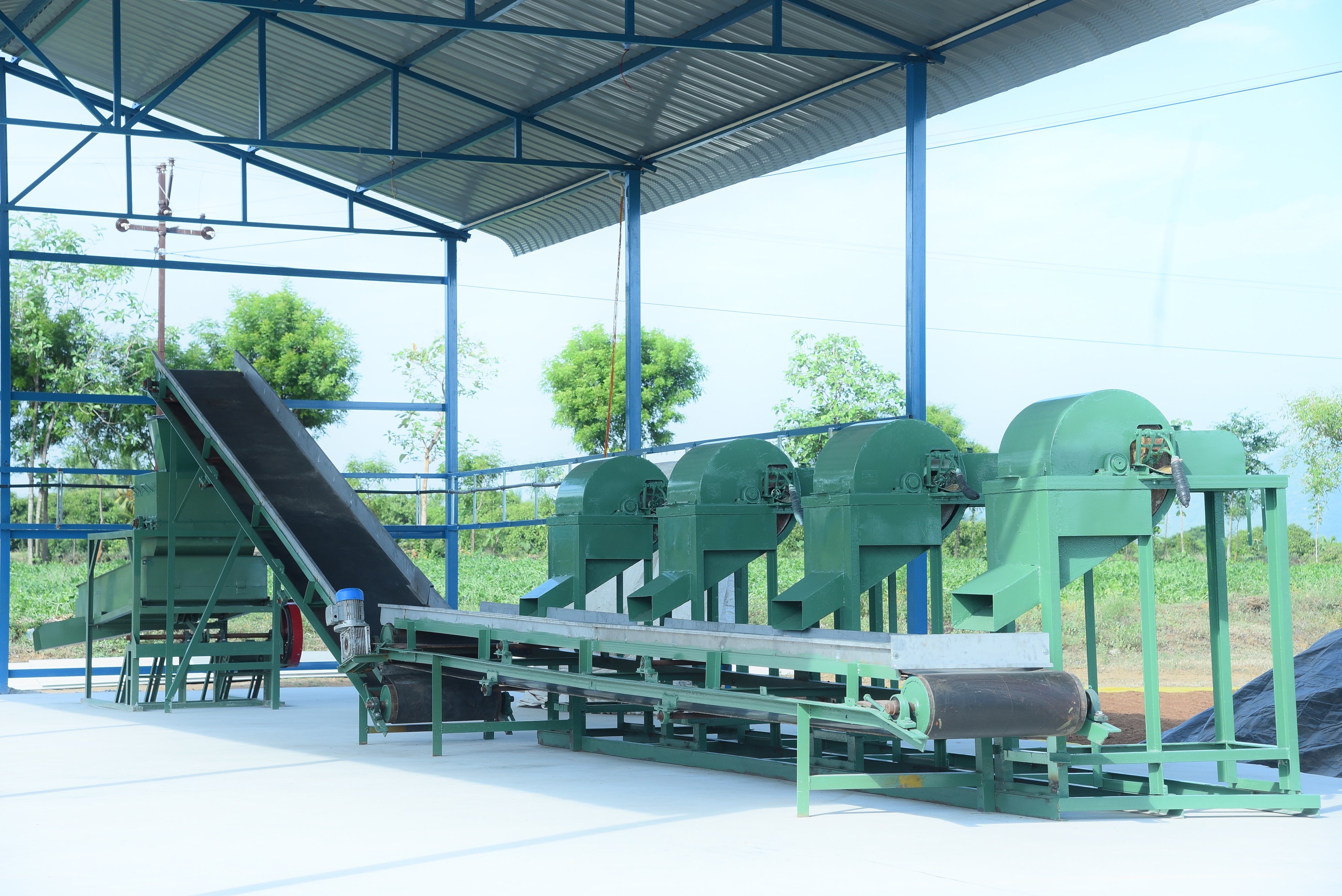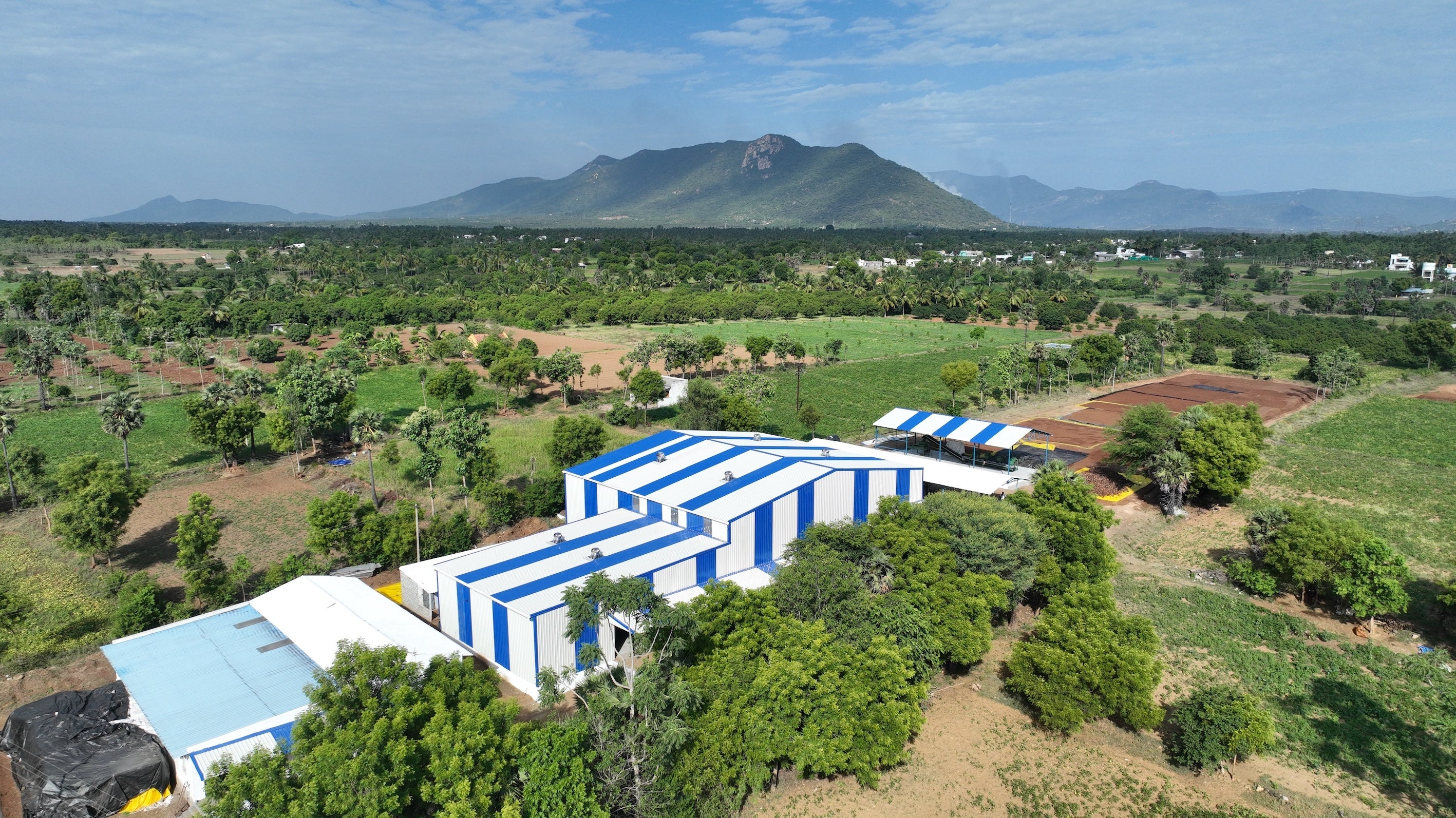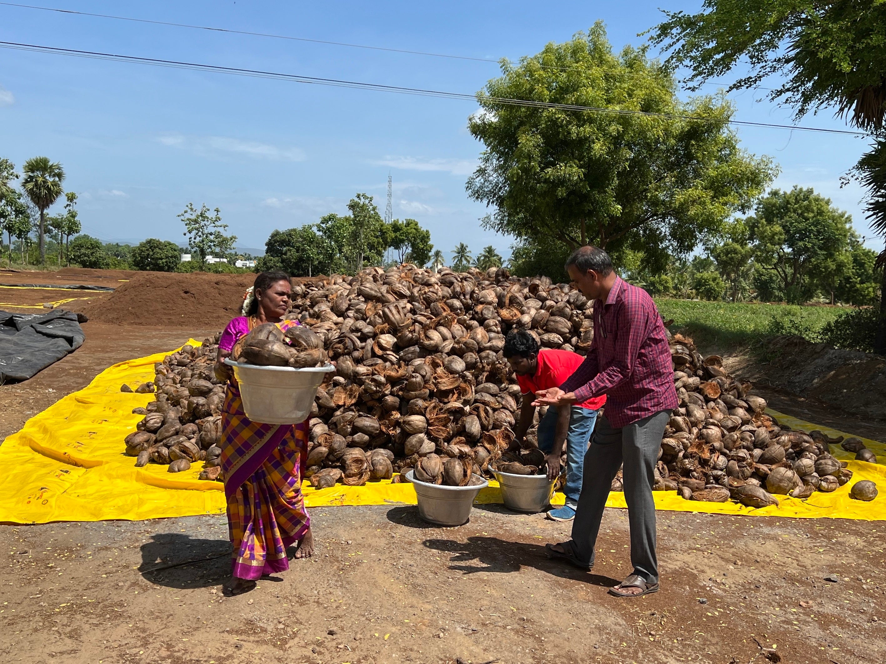 ココカラは2016年の設立以来、品質にこだわったココピート(ヤシガラを原料とした天然有機質100%の有機培土)を農家の方々に提供してまいりました。2021年にはJETROの支援(※)によってヴィルタサンパッティ(インドでも有数のココナッツ産地セーラムから約37キロにある町)に小型ココピート製造機を設置し、近隣の小規模ココナッツ農家が各自のココナッツを持ち込んでココピートを共同製造できるシステムを構築しました。毎年多くの農家の方々にココカラのココピートをご利用いただいている一方、ココカラのココピートの認知度が上がると共に商品需要も高まり、より安定した製品の供給体制が必要となりました。そこでこの度、これまで所有していたヴィルタサンパッティの敷地を3エーカーから10エーカーに拡大。新たに13m×17m×6.5m(高さ)のシーヴィングエリアと、22m×24m×10m(高さ)のメイン生産工場を設置し、最新の機材を導入することで年間を通してさらに安定した製品供給ができる体制を構築しました。