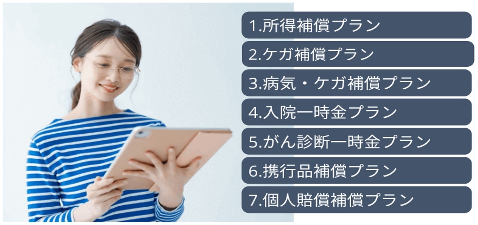 病気・ケガへの補償に加え、それによる所得減少に備えた所得補償、仕事に欠かせない腕時計やカメラなど携行品への補償、自転車で歩行者をけがさせたなどの日常生活における損害賠償補償など、必要な補償をご用意しています。