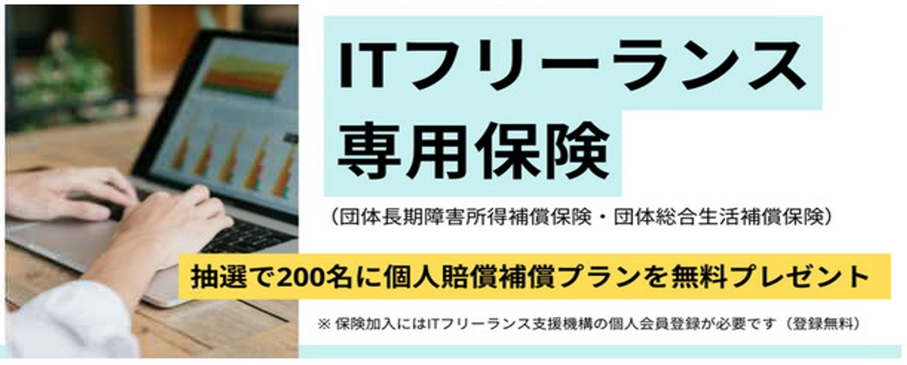 なお、同日よりITフリーランス支援機構へ個人会員の加入受付を開始しました。個人会員加入開始の記念としてご加入頂いた方から抽選で200名様に「個人賠償補償プラン」を無料でセットいただけるご加入キャンペーンを開催します。