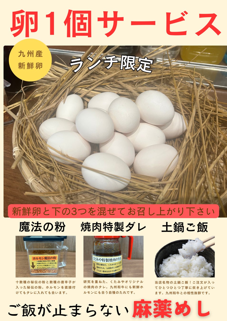 ランチタイムには新鮮卵を1個無料サービスしております。当店自慢の焼肉特製ダレと魔法の粉を混ぜて食べる麻薬メシ(究極のTKG)はやみつきになる事間違いなし!