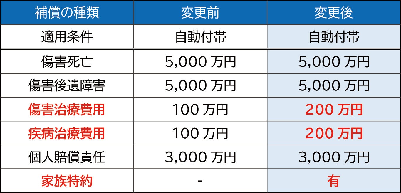 傷害・疾病治療費用の補償額を100万円から200万円へ増額します。また、家族特約を追加いたします。