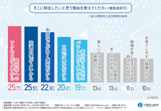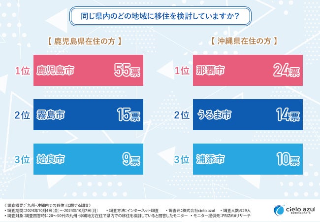 株式会社cielo azul(本社所在地:福岡県福岡市、代表取締役:大泉 聡)は、20~50代の九州・沖縄地方在住で県内での移住を検討している方を対象に、「九州・沖縄それぞれ地元内で選んだ「住みたい移住先」に関する調査を実施しました。