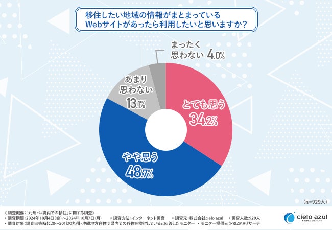 そこで、「移住したい地域の情報がまとまっているWebサイトがあったら利用したいと思いますか?」と質問したところ、約8割の方が『とても思う(34.2%)』『やや思う(48.7%)』と回答しました。