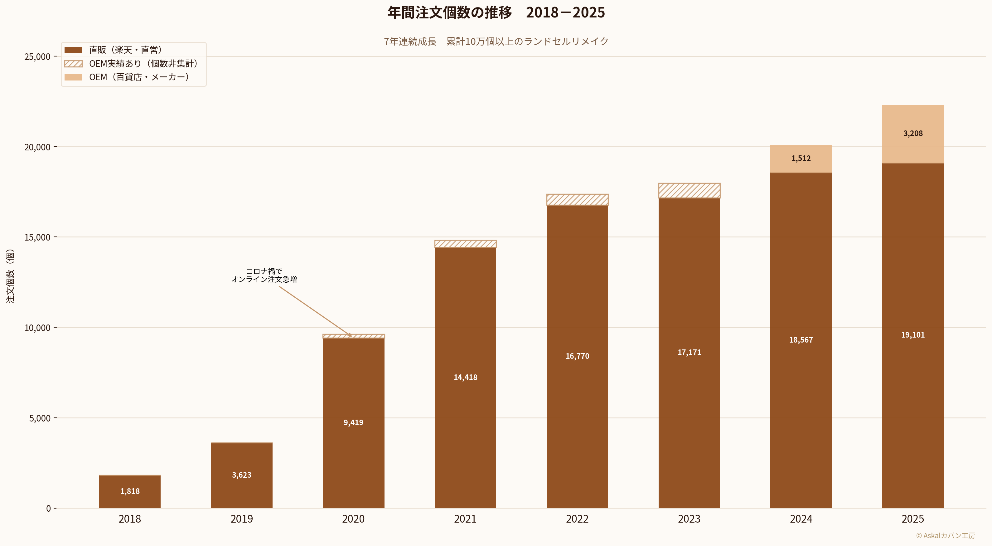 なぜ7年間、一度も前年を下回らなかったのか。理由は値引きでもキャンペーンでもありません。ランドセルリメイクは、完成品が家に届いた瞬間から口コミが始まります。完成品を見た兄弟が「私も絶対リメイクしたい」と言い、ランドセルを大切に扱い続ける。手紙を書いたお母さんが友人に話し、その友人が次の春に注文する。職人の顔が見えるから信頼され、信頼されるから選ばれ続ける。そして毎年3月、卒業シーズンを迎えるたびに新しいお客様が生まれる。注文が注文を呼ぶ構造が、Askalの成長を7年間支え続けてきました。