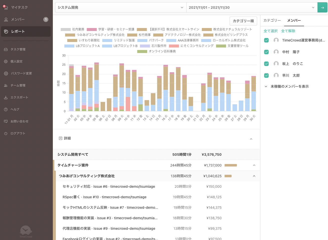 TimeCrowdは、タイムトラッキングツールです。「誰が」「どの業務を」「どのくらい」行っているかをリアルタイムで把握できることに加え、会社や部門全体の業務時間の内訳を見える化することが可能です。それにより、業務見直しによる生産性向上、プロジェクトごとの人件費含めた収益改善を実現することが出来ます。