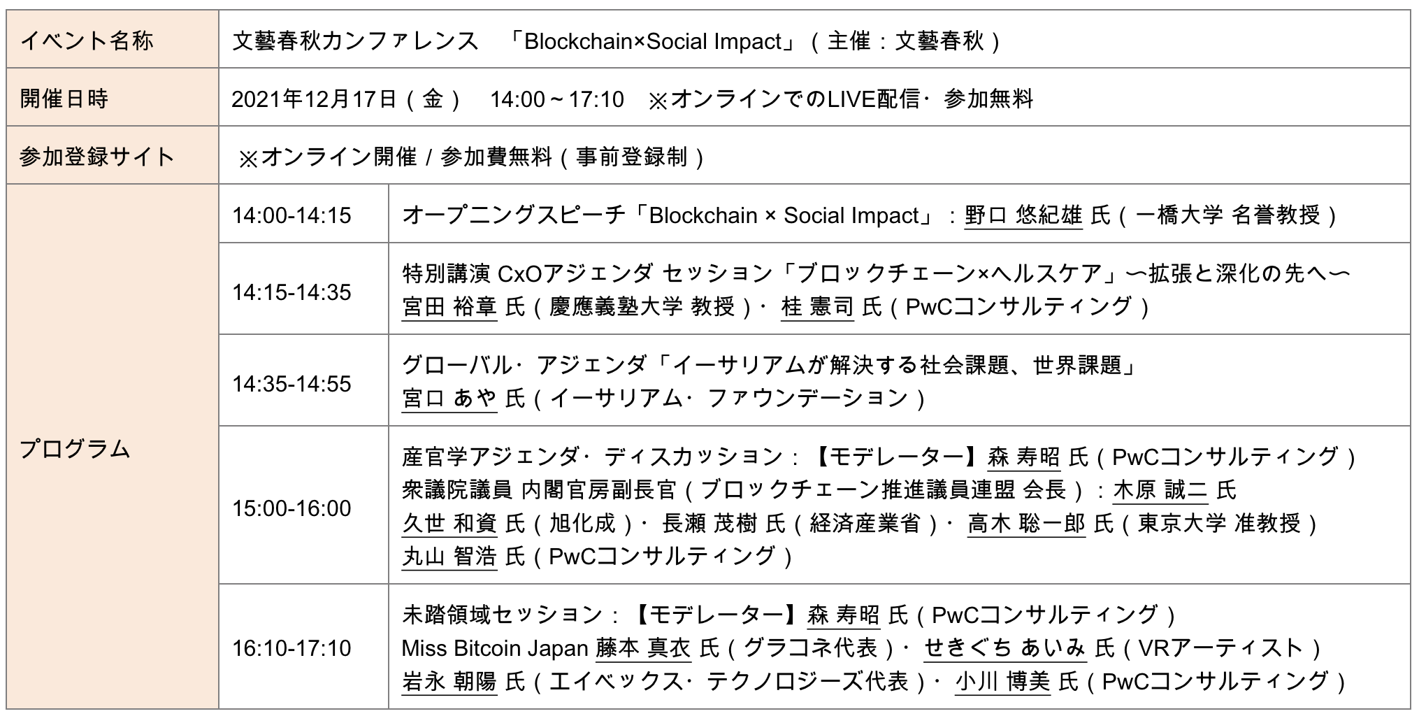 ■文藝春秋カンファレンス「Blockchain × Social Impact」の概要(公式サイトより一部抜粋)