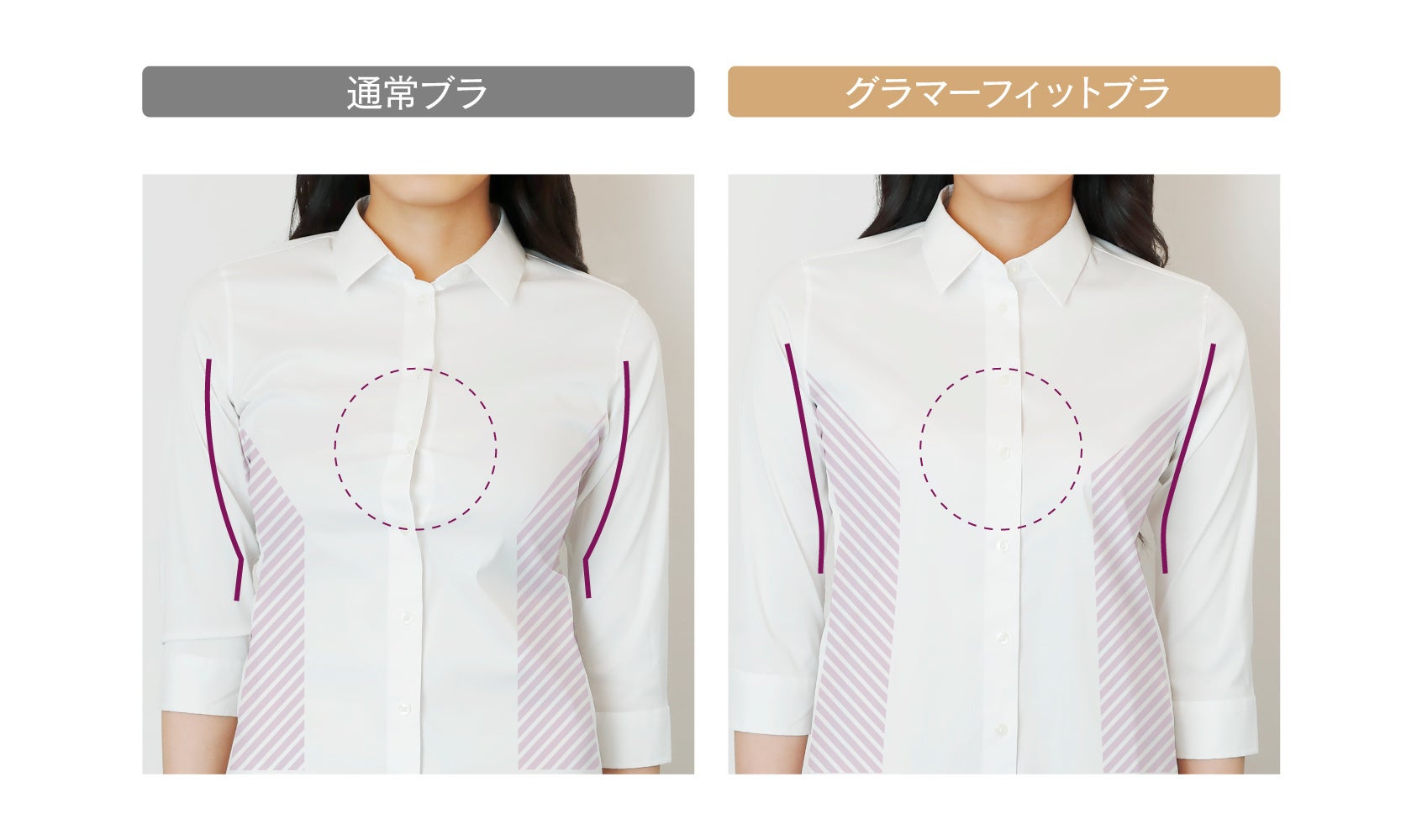 グラマーフィットブラはボリュームのあるバストを内側と上胸にプッシュするので、ボディラインがすっきり見え、着こなしまでキレイになります。