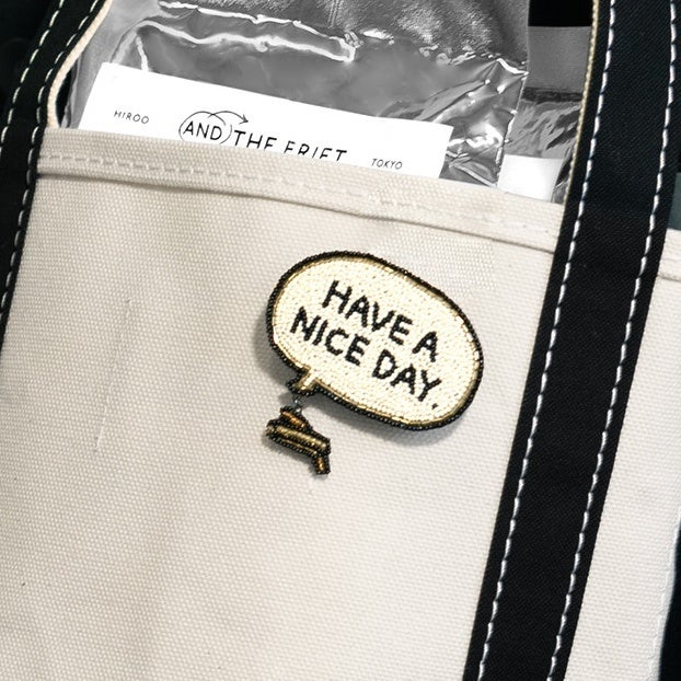 ひと言メッセージとしてAND THE FRIETのパッケージに書かれている“HAVE A NICE DAY.”を吹き出しで表現したブローチは、上質なヴィンテージビーズの輝きがポイント。ユニセックスなテイストなので、シンプルコーデのオシャレ度をアップさせる小物としてお楽しみください。