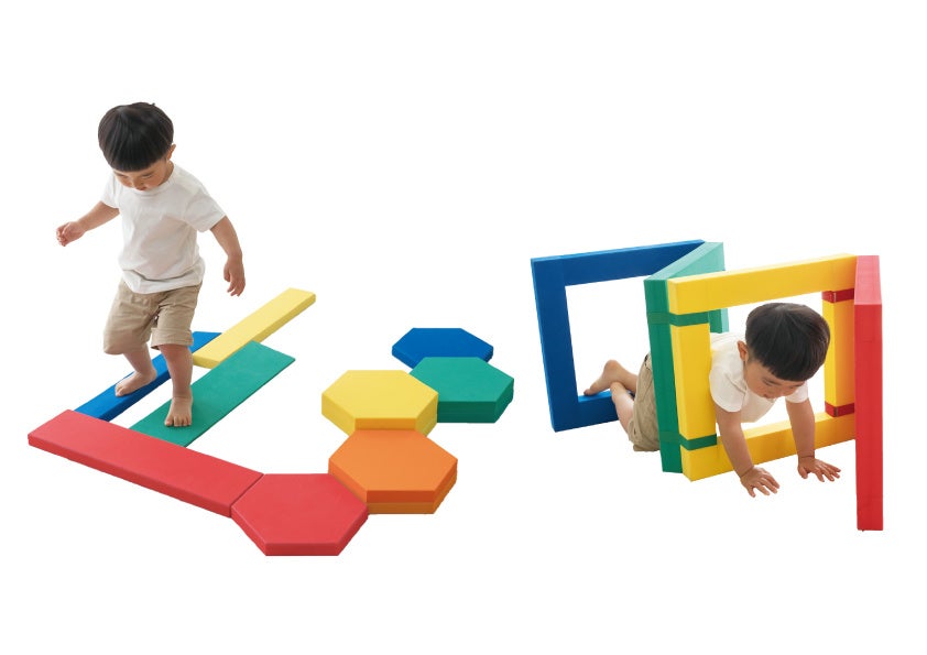 運動発達に合わせて難易度を変えた、様々な種類の運動あそびができる柔らかい低年齢児向けの運動教具。