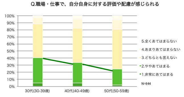 ・30代~50代の男性に「職場・仕事で、自分自身に対する評価や配慮が感じられる」かどうか質問しました。