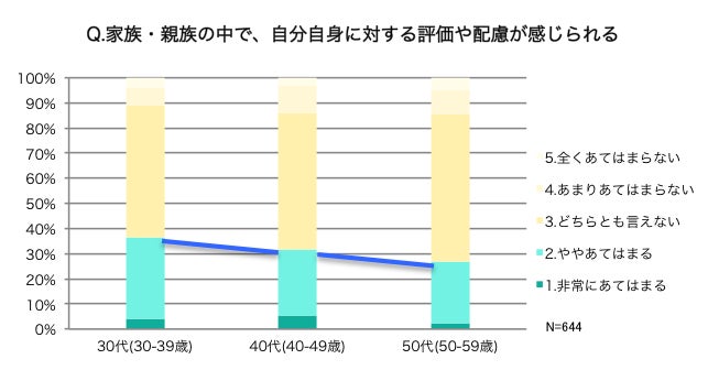 ・30代~50代の男性に「家族・親族の中で、自分自身に対する評価や配慮が感じられる」かどうか質問しました。