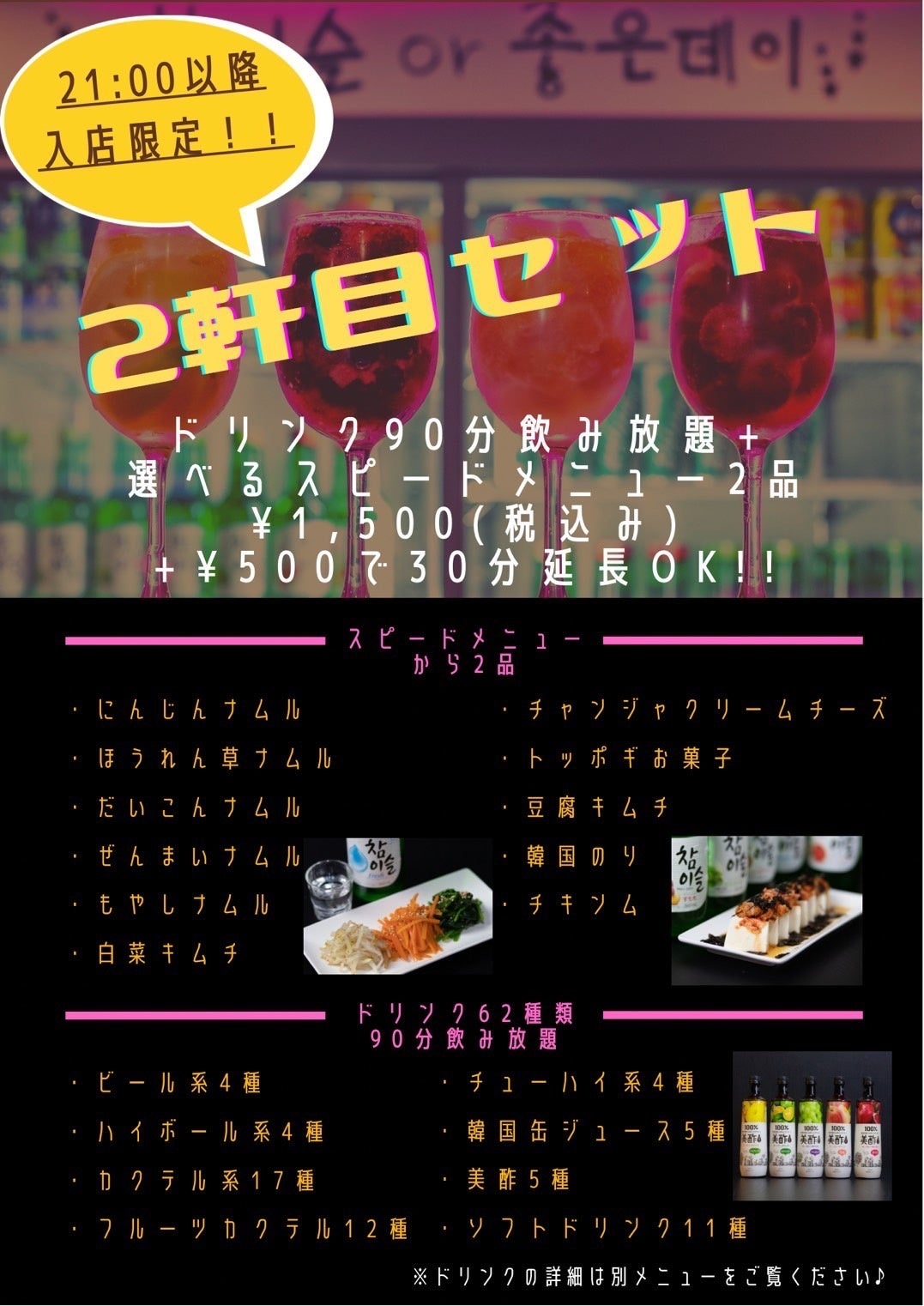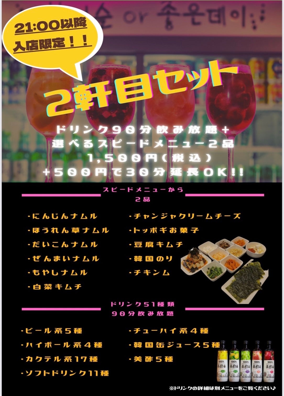 21:00以降の入店のお客様限定で、スピードメニュー2品+ドリンク51種類90分飲み放題セットメニューを提供いたします。
