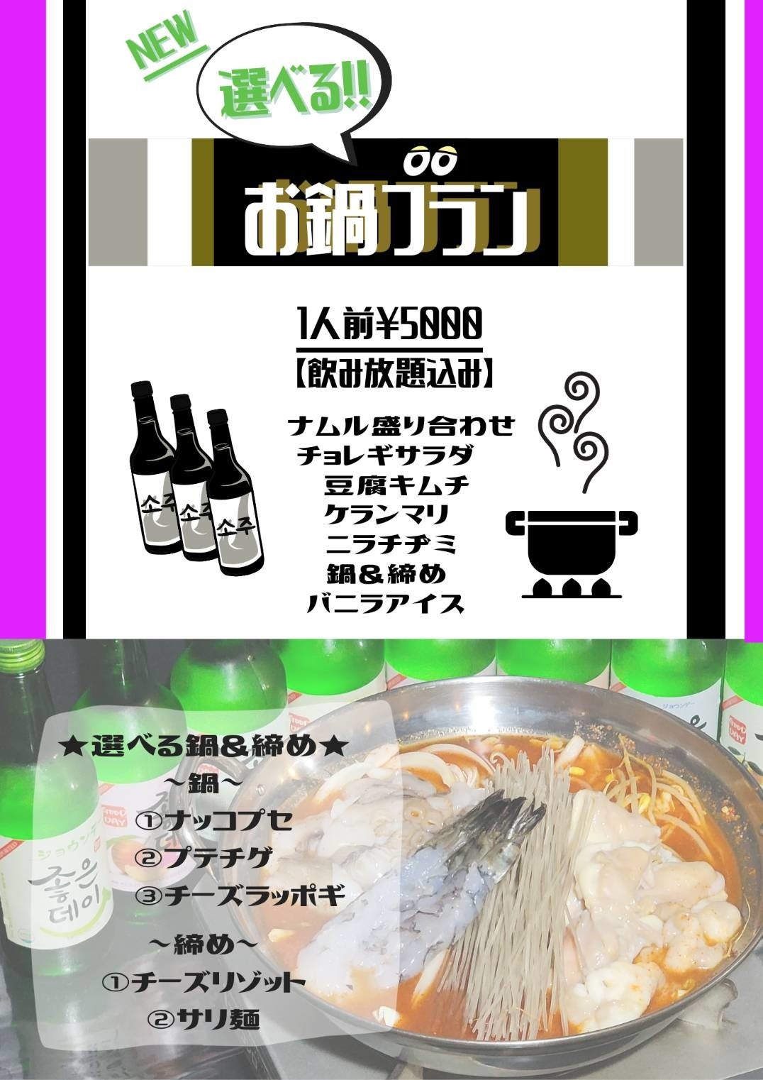 鍋(①ナッコプセ②プテチゲ③チーズラッポギ)①〜③のいずれか